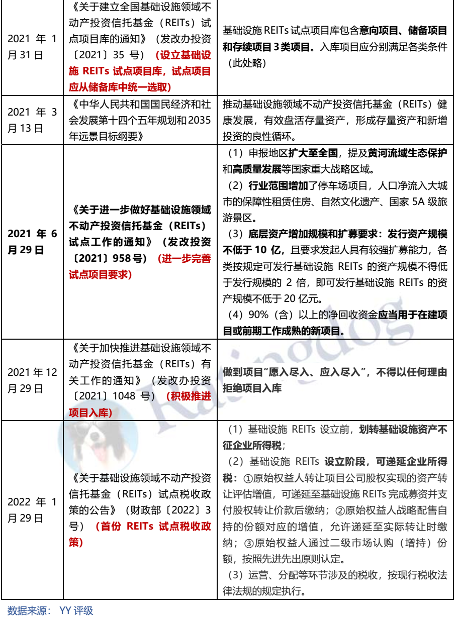 出于盤活存量資產,打通投融資渠道的目的,我國公募REITs從基礎設施領域開始。2020年40號文件標志境內公募REITs產品試點正式開始,后續緊跟一系列政策文件,完成了整個政策框架和業務規則的制訂。