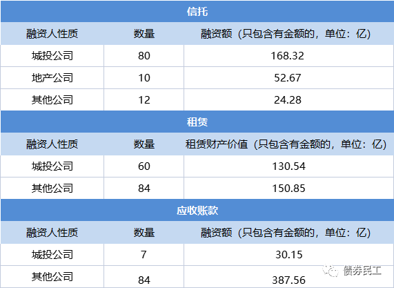 根據(jù)DM的統(tǒng)計(jì)信息,2021年4月18日-5月14日,發(fā)行過債券的城投公司在約一個月內(nèi),共實(shí)現(xiàn)了147筆非標(biāo)融資,合計(jì)金額為329.01億元,超過300億元!其中:城投公司實(shí)現(xiàn)了80筆信托融資,合計(jì)金額為168.32億元;實(shí)現(xiàn)了60筆融資租賃融資,合計(jì)金額為130.54億元;實(shí)現(xiàn)了應(yīng)收賬款融資7筆,合計(jì)金額為30.15億元。