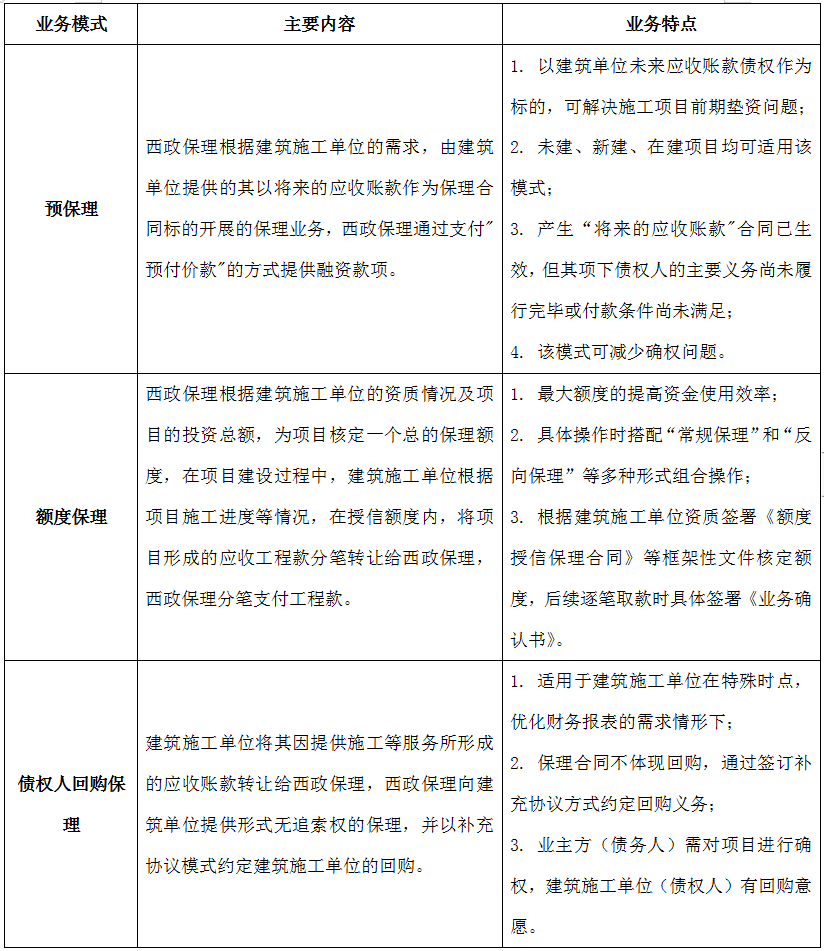 對(duì)于國(guó)央企建筑施工單位的供應(yīng)鏈保理業(yè)務(wù),目前主要的業(yè)務(wù)模式包括以國(guó)央企建筑施工單位未來(lái)應(yīng)收賬款為保理合同標(biāo)的的預(yù)保理業(yè)務(wù);給予國(guó)央企建筑施工單位授信額度的額度保理;債權(quán)人回購(gòu)保理及業(yè)主貼息保理模式。具體如下: