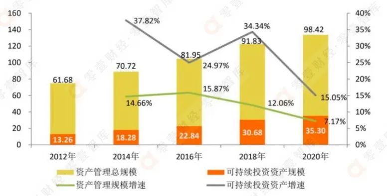 “雙碳”目標(biāo)下,ESG投資也愈發(fā)火熱。根據(jù)全球可持續(xù)投資聯(lián)盟披露的數(shù)據(jù),圍繞于全球主要地區(qū)(歐洲、美國(guó)、加拿大、日本、大洋洲)的ESG投資資產(chǎn)管理規(guī)模從2012年初的13.2萬(wàn)億美元,提升至2020年初的35.3萬(wàn)億美元,年復(fù)合增速為13.02%,遠(yuǎn)超過(guò)全球資產(chǎn)管理行業(yè)6.01%的整體增速。從中國(guó)的ESG投資發(fā)展來(lái)看,截至2020年10月,A股市場(chǎng)ESG基金總規(guī)模合計(jì)約1287億元。