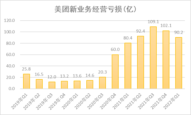 而美團(tuán)為此付出的代價(jià)則顯而易見(jiàn)。2021年,該三項(xiàng)業(yè)務(wù)便給美團(tuán)帶來(lái)了高達(dá)384億元的虧損。受此拖累,新業(yè)務(wù)虧損一路走高,至2021年Q3和2021年Q4,美團(tuán)新業(yè)務(wù)虧損金額則分別達(dá)到驚人的109億元和102億元。
