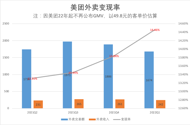 如果按照美團(tuán)2021年平均約49元的客單價(jià)計(jì)算,2022年第一季度的變現(xiàn)率約為14.67%;即使以券商推算的較高值49.8元進(jìn)行計(jì)算,變現(xiàn)率仍然達(dá)到14.46%,依然是歷史新高。