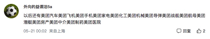 “以后還有美團(tuán)汽車(chē)、美團(tuán)飛機(jī)、美團(tuán)手機(jī)、美團(tuán)家電、美團(tuán)化工、美團(tuán)機(jī)械、美團(tuán)導(dǎo)彈、美團(tuán)戰(zhàn)艦、美團(tuán)航母、美團(tuán)潛艇、美團(tuán)房產(chǎn)、美團(tuán)中介、美團(tuán)制藥和美團(tuán)醫(yī)院。”