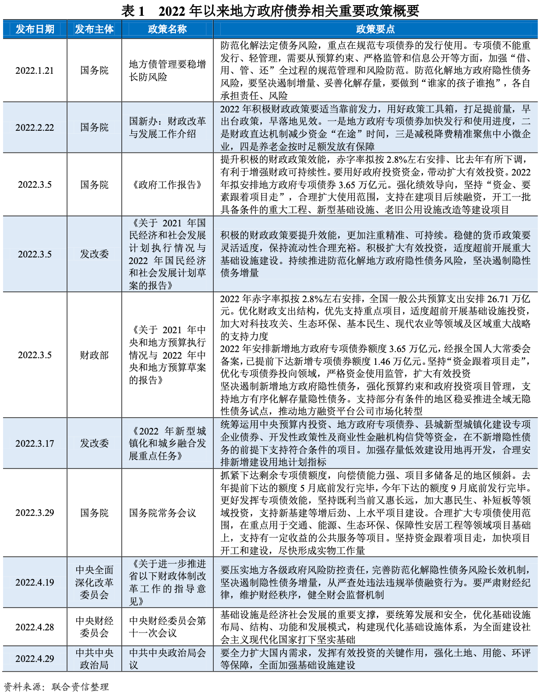 一是繼續做好“六穩”“六保”工作,一季度地方債發行前置,2022年專項債下達額度9月底前發行完畢。2021年12月,財政部已向各地提前下達2022年新增地方政府債務限額1.79萬億元,其中一般債務限額0.33萬億元,專項債務限額1.46億元;2022年《政府工作報告》確定今年地方政府新增債務限額為4.37萬億元,其中新增一般債限額0.72萬億元,較上年小幅下降0.1萬億元;新增專項債額度3.65萬億元,與上年持平,較為充足的限額為繼續做好“六穩”“六保”工作提供重要支撐。在穩增長要求下,2022年,地方債發行明顯前置,一季度地方債共計發行1.82萬億,其中新增一般債2720億元,新增專項債1.3萬億,置換和再融資債券2545億元。2022年3月,國務院總理李克強主持召開國務院常務會議,部署用好政府債券擴大有效投資,會議提出抓緊下達剩余專項債額度,向償債能力強、項目多儲備足的地區傾斜,要求2021年提前下達的額度5月底前發行完畢,2022年下達的額度9月底前發行完畢。