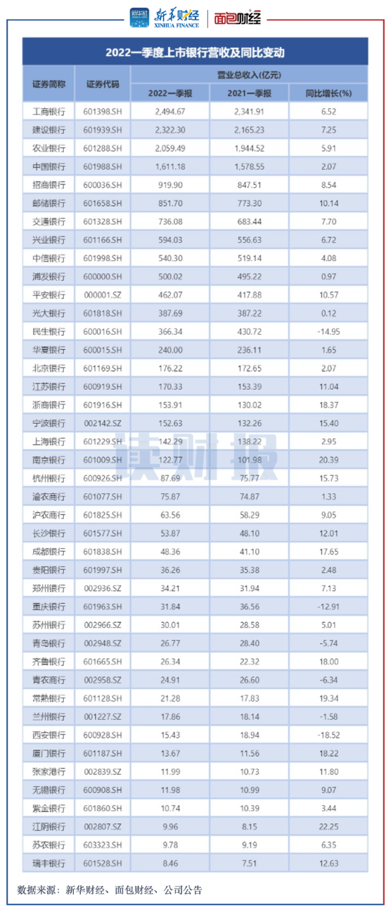 數據顯示,2022年一季度42家上市銀行合計實現營收1.57萬億元,較上年同期增長5.64%。其中,36家上市銀行營業收入較上年同期出現增長,僅6家銀行營收同比下降。