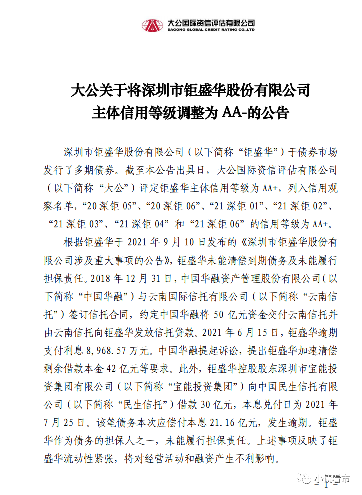 9月23日,大公國際公告稱,將深圳市鉅盛華股份有限公司(以下簡稱“鉅盛華”)主體和相關債項信用等級由AA+下調至AA-,評級展望調整為負面。