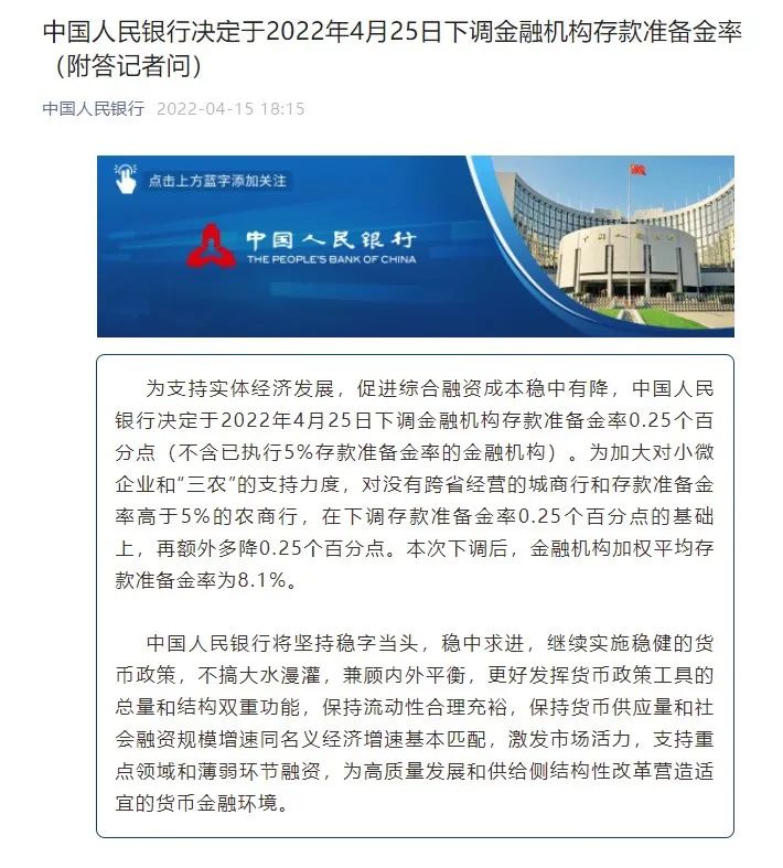 決定于2022年4月25日下調金融機構存款準備金率0.25個百分點(不含已執(zhí)行5%存款準備金率的金融機構)。