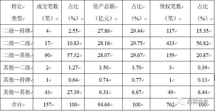 本轉讓類型共發生兩筆交易,在轉讓人為無錫和平健康投資有限公司、受讓人分別為黑龍江國投穗甬資產管理有限公司的交易中,資產總額為1.75億元,涉及債權2筆。在轉讓人合肥龍盛建設工程有限公司、受讓人華滬銀奧的交易中,資產總額1.74億元,涉及債權1筆。