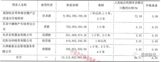 乍一看好像沒有什么問題,第一大也是最主要的欠款方式政府,主要是棚改方面的款項(xiàng);第三大欠款方京糧置業(yè)是首農(nóng)集團(tuán)下面的全資公司,這個(gè)也沒啥問題;其余三個(gè)如果細(xì)心用天眼查等軟件一查詢,就會(huì)發(fā)現(xiàn)問題:其中,北京中融物產(chǎn)有限責(zé)任公司是天津融泰企業(yè)管理服務(wù)有限公司的全資子公司(也就是第五大欠款方),進(jìn)一步查詢天津融泰的股權(quán),則會(huì)發(fā)現(xiàn)其實(shí)該發(fā)行人與北京國安控股有限公司的合營公司,雙方各持股50%,而北京國安控股有限公司向上穿透則會(huì)發(fā)現(xiàn)其是中信國安集團(tuán)有限公司的全資孫公司,而中信國安已經(jīng)發(fā)生了債務(wù)違約。目前涉及到中信國安的這兩筆其他應(yīng)收款合計(jì)近11億,且賬齡較長(zhǎng),在存在較大回收風(fēng)險(xiǎn)的情況下都未計(jì)提壞賬準(zhǔn)備,至少在目前看來是存在問題的;第四大欠款方沈陽協(xié)和投資有限公司則是自然人郭淑琴(持股60%)和郭文颙(持股40%),該筆款項(xiàng)性質(zhì)是投資款,可能是公司與其之間存在股權(quán)轉(zhuǎn)讓之類的事項(xiàng),但對(duì)方還沒有付款,因?yàn)閷?duì)方是自然人控制的民企,實(shí)際回款情況也需要進(jìn)一步核實(shí),是否存在壞賬風(fēng)險(xiǎn)。