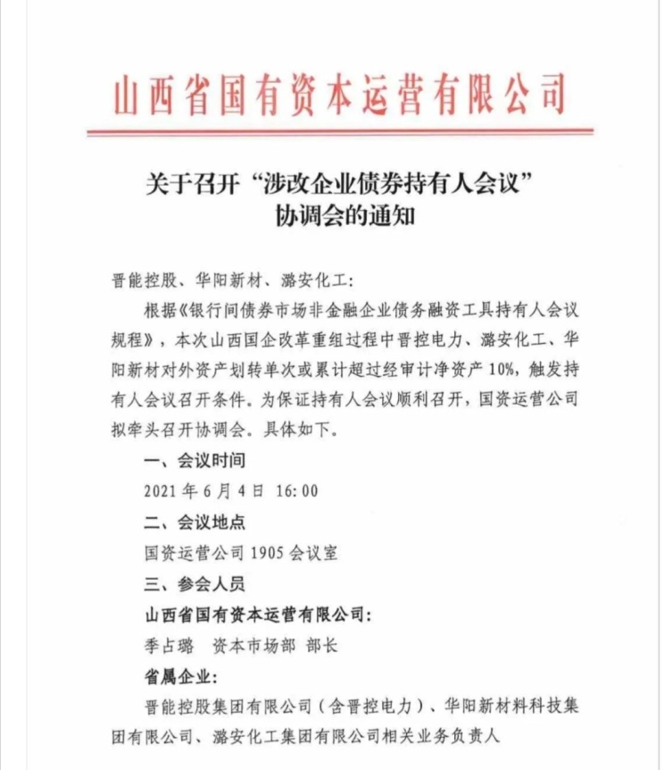 業內近兩日傳播的一份文件顯示,山西國資于6月4日組織了晉控集團、華陽新材料、潞安化工等幾家省內企業,計劃協調召開“涉改企業債券持有人會議”:
