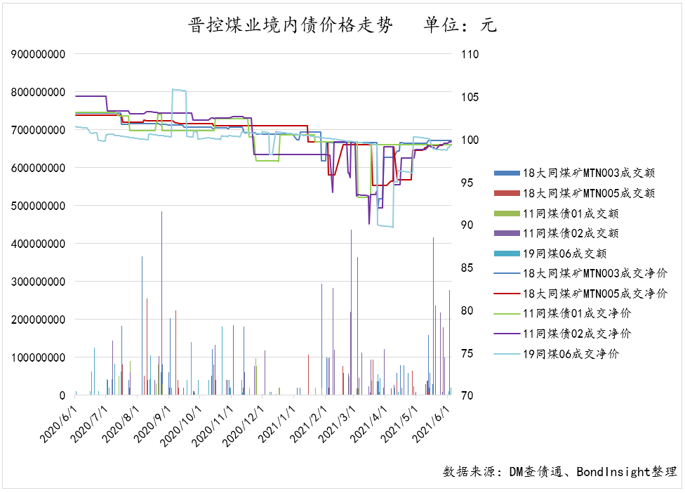 隨著信用債市場的信心修復和煤炭價格的抬升,煤炭產業債券估值上行的壓力略有緩解,前期二級市場價格下挫較大的煤企債券,5月以來都有修復態勢,以山西煤企整合進程中的主角晉能控股煤業集團(下稱“晉控煤業”,原“同煤”)為例,多只債券的成交凈價都回到了95-98附近。