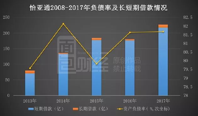 最近幾年,怡亞通的負債及負債率維持在高位。如下圖: