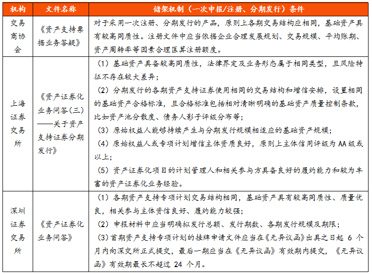 從三監管機構的規定看,儲架模式需要至少需要滿足交易結構、基礎資產、增信主體三方面要素的相似性。