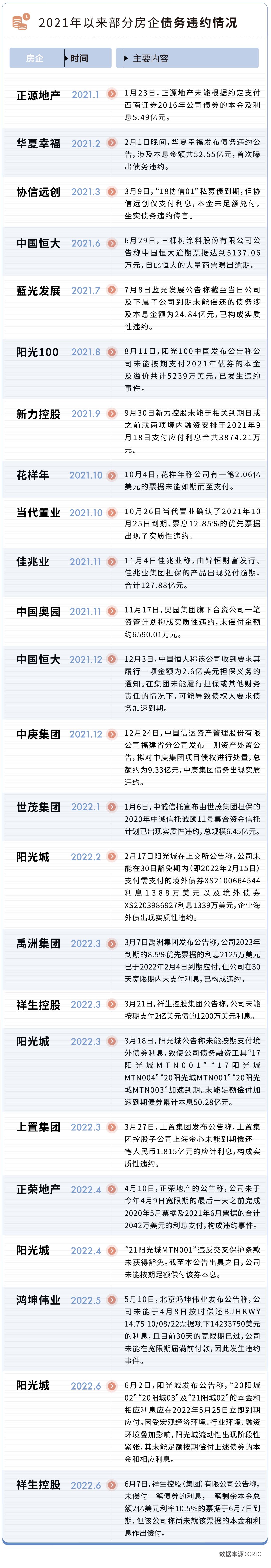 2022年2月17日,陽光城公告兩筆海外債出現實質性違約成為第一塊多米諾骨牌,后續不斷出現多只債券違約,至5月陽光城境外公開市場債券未按期支付本息累計1.09億美元,境內公開市場債券未按期支付本息累計81.67億元。