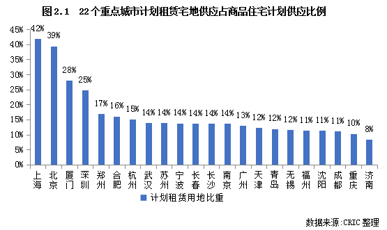 通過對22個重點城市2021年供地計劃中商品住宅及租賃住宅用地的規模進行梳理和測算,結果發現:除濟南外,其余21個城市租賃房供地計劃占比均高于10%,尤其是北京和上海兩個一線城市,租賃宅地占商品住宅用地的比重均在四成左右;其次是廈門、深圳、合肥、杭州等城市,比重均超15%;余下的重點城市中,除濟南相對較低之外,其余城市租賃宅地計劃供應量均按照中央10%的“紅線”設置,約在10%左右。