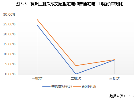 從上節可以看出,配租宅地往往位于中心城區及郊區的熱點片區,而普通商品住宅用地則大多位于臨安等遠郊片區或為土地性質較為復雜的宅地,房企拿地意愿不高。因此,從成交溢價率來看,配租宅地的平均成交溢價率往往也高于普通商品住宅地塊,即使在熱度明顯下降的第二批亦是如此。