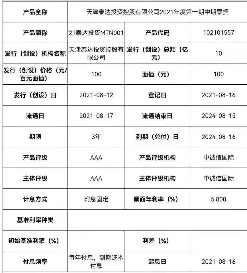 2021年8月16日,天津泰達(dá)投資控股有限公司(以下簡(jiǎn)稱(chēng)“泰達(dá)控股”)發(fā)行的“21泰達(dá)控股MTN001”正式起息。泰達(dá)控股本期中期票據(jù)的發(fā)行規(guī)模10億元,債券期限3年,票面利率為5.80%。這是6月份天津召開(kāi)債券市場(chǎng)投資人懇談會(huì)之后,泰達(dá)控股首次成功發(fā)行長(zhǎng)期限信用債券!!!更關(guān)鍵的是,本期中期票據(jù)的發(fā)行利率大幅下降,標(biāo)志著投資者對(duì)于泰達(dá)控股的充分認(rèn)可,意味著泰達(dá)控股在信用債券市場(chǎng)上王者歸來(lái)!