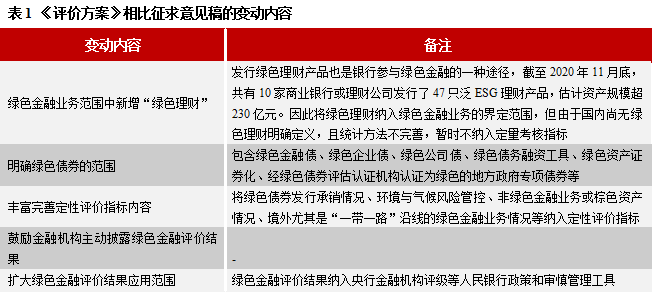 6月9日,人民銀行發布《銀行業金融機構綠色金融評價方案》,是在2020年7月21日《關于印發〈銀行業存款類金融機構綠色金融業績評價方案〉的通知(征求意見稿)》(以下簡稱“征求意見稿”)的基礎上發布的正式版本。《評價方案》將于2021年7月1日起施行。評價指標和方法上采用定量(權重80%)和定性(權重20%)結合的方法,其中定量指標有4個,定性評價指標有3個。與征求意見稿相比,正式版《評價方案》的變動如下表所示。