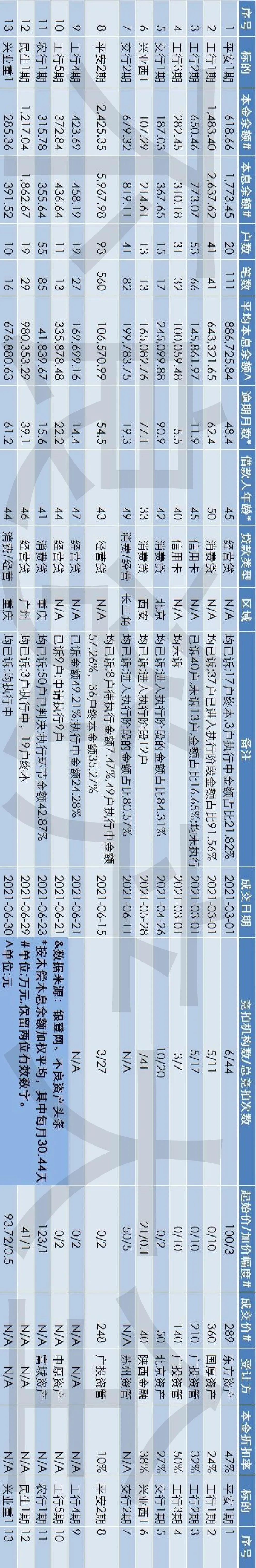 自今年3月1日首期個人不良貸款批量轉讓成交以來,截止本文撰寫時(7月14日),有平安銀行、工商銀行、交通銀行、興業銀行、農業銀行和民生銀行等共6家銀行13期銀行個人不良貸款在銀登中心競價成交。