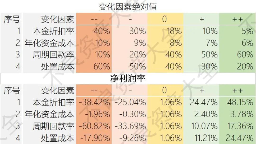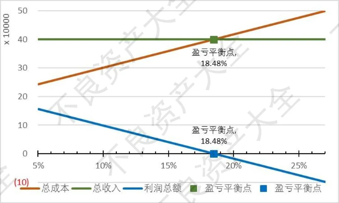 如上圖表,以未償本金余額100萬的銀行個貸不良資產為例,在假設條件下,理想狀態達到盈虧分界點的個貸不良資產價格約為18.48%.也即,當銀行個貸不良資產成交本金折扣率小于18.48%時,該不良資產按假設條件處置可以盈利,反之反是。