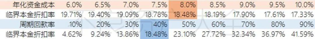 表4-2顯示了在其他假設條件均不變的情況下,單一因素年化資金成本或周期回款率分別對銀行個貸不良資產盈虧平衡價格(臨界本金折扣率)的影響。值得注意的是,以目前已經成交的銀行個貸不良資產質量來看,24個月的周期回款率估計在10%-40%之間。