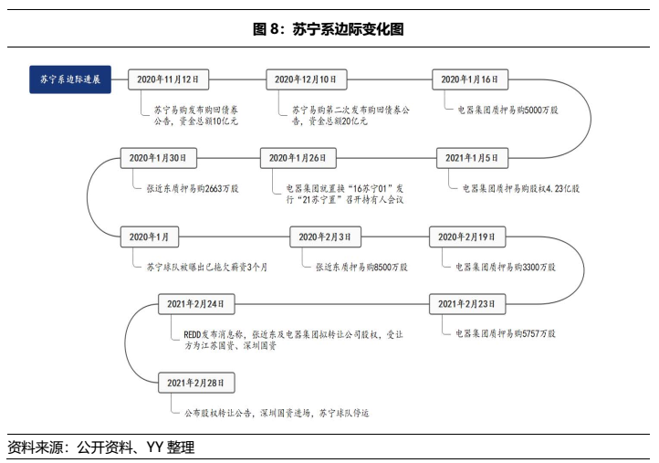 同天,蘇寧球隊發布了停運的公告,追溯1月的輿情可以發現,之前蘇寧球隊就爆出欠薪三個月的消息,也印證了之前整個蘇寧系流動性的緊缺,另外此番剝離球隊,也有回歸主業,剝離無關副業的決心。