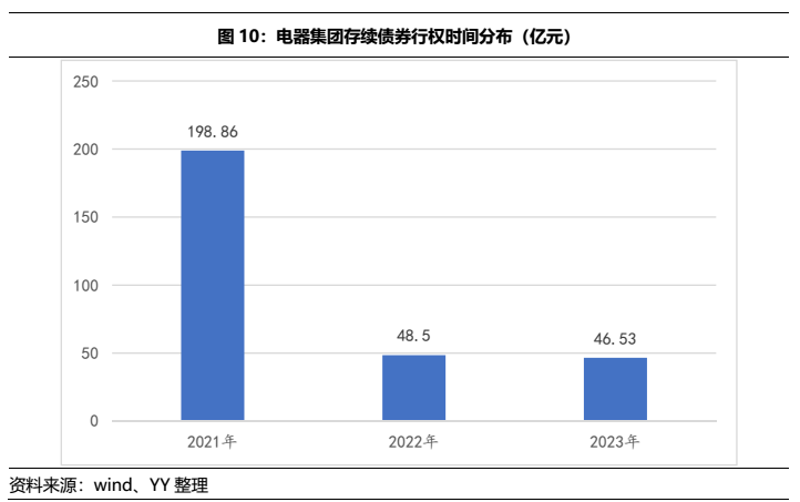 截至2021年3月1日,電器集團存續債共20只,其中私募債12只,另有6只ABS和2只ABN,合計293.89億元。按行權時間統計,最近一只是3月22日面臨行權的合計16.4億元“17蘇寧01”。債券行權分布來看,2021年是集團壓力最重的一年,面臨198.86億元的兌付(包含83.35億元的ABS和10.63億元的ABN);2022面臨48.5億元的行權(包含28億元的20蘇寧A1、4億元的20蘇寧A2);2023年有46.53億元的行權。