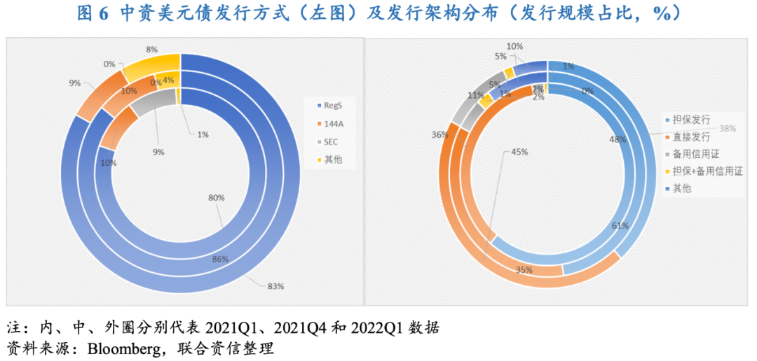 從發行架構[6]看,2022年一季度,擔保發行和直接發行仍是中資美元債最主要的兩種發行架構。具體來看,采用直接發行的債券發行金額達到168.4億美元,占總規模比為44.5%,環比和同比分別上升9.2個和8.7個百分點,首次超過擔保發行的債券規模;采用擔保發行的發行規模達到144.6億美元,約占總發行規模的38.2%,環比和同比分別下滑9.2個和23.1個百分點;采用備用信用證發行的債券的發行規模達40.2億美元,占總規模的10.6%,環比和同比上漲5.8個和8.4個百分點,由于備用信用證發行架構采用境內銀行背書的方式對債券形成一定外部信用支撐且成本相對較低,因此在房地產信用風險外溢的背景下,采用備用信用證發行架構的方式正逐步受到投資人青睞;采用擔保+備用信用證的債券發行規模達5.2億美元,占總規模的1.4%,環比下滑0.8個百分點,但同比上漲0.8個百分點;此外,本季度沒有以維好架構以及擔保+維好雙重架構增信的中資美元債,表明市場對于維好架構的增信作用越來越不認可。