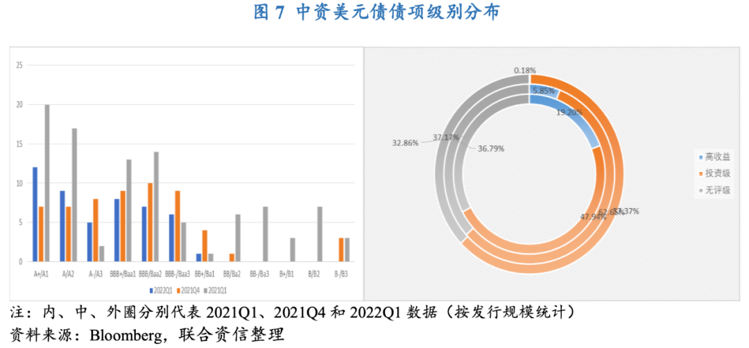 在有評級的中資美元債中,2022年一季度投資級中資美元債發行規模為237.1億美元,合計占總發行規模的62.7%,環比和同比分別上漲了5.3個和14.7個百分點。此外,高收益中資美元債(BBB-級以下[8])受信用風險事件持續發酵的影響而發行驟減,本季度發行規模僅為0.7億美元,占總發行規模的0.2%,環比和同比分別下滑5.7個和19.0個百分點。