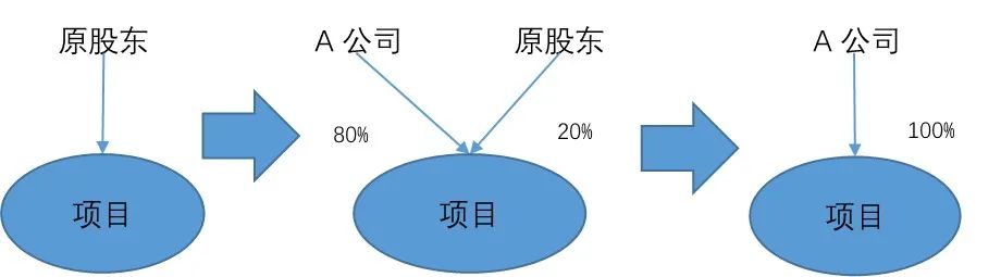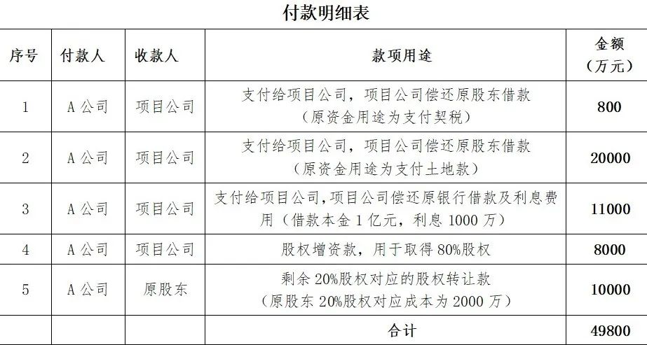 A公司先增資8000萬元進(jìn)入某項(xiàng)目公司,取得該公司80%股權(quán),后續(xù)又通過股轉(zhuǎn)方式取得剩余20%股權(quán),股權(quán)轉(zhuǎn)讓價(jià)格10000萬元。具體支付款項(xiàng)見下述明細(xì)表: