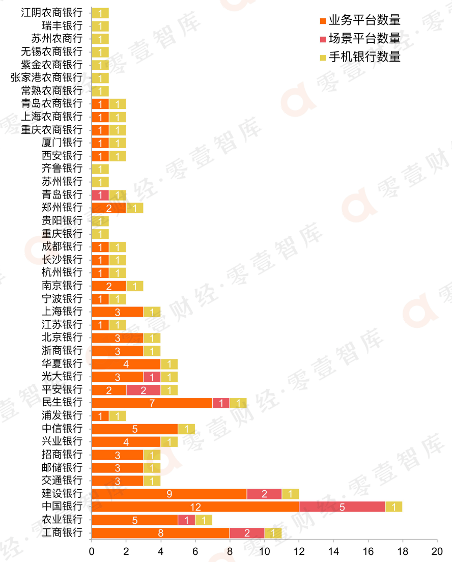 從結構來看,銀行App矩陣基本由手機銀行、業務平臺和場景平臺3個部分組成。其中,7家銀行(4家國有大行、3家全國性股份行)開發的App涵蓋手機銀行、業務平臺和場景平臺3種類型,22家(2家國有大行、5家全國性股份行、12家城商行、3家農商行)銀行開發的App涵蓋手機銀行、業務平臺2種類型,1家銀行(青島銀行)開發的App涵蓋手機銀行、場景平臺2種類型,11家銀行(4家城商行、7家農商行)開發的App涵蓋手機銀行1種類型。