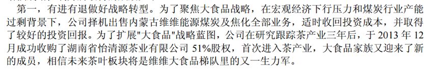 2013年12月,維維股份以7650萬元的對價收購了湖南省怡清源茶業(yè)有限公司51%的股權(quán)。公司在2013年年度報告中表示: