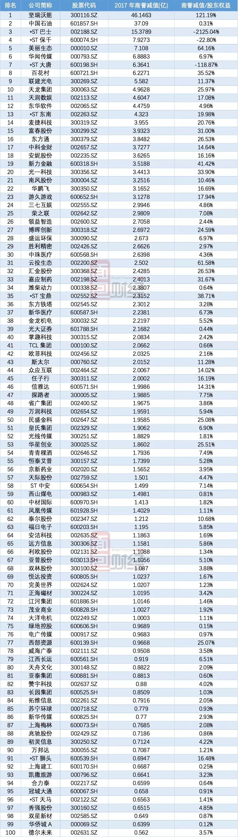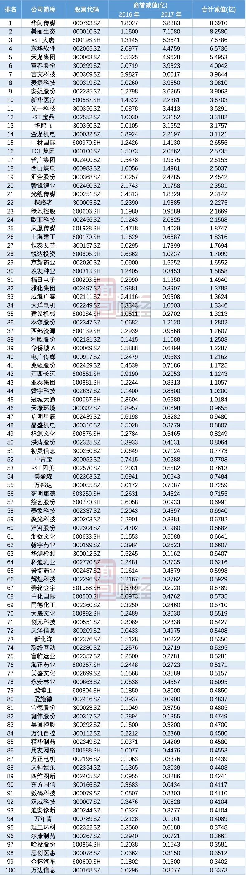 其中,有176家公司2016和2017年連續(xù)兩年出現商譽減值。兩年合計減值金額排名前100的公司如下: