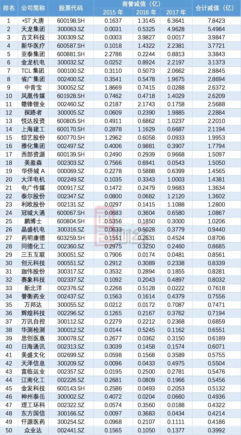 在這里面,還有75家公司2015—2017年連續(xù)三年出現商譽減值,累計金額排名前50的上市公司如下: