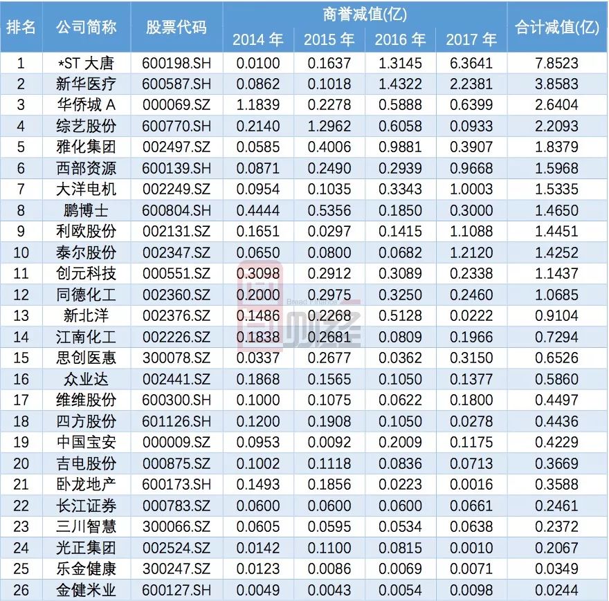 更有26家公司2014至2017年,連續(xù)四年商譽減值,名單如下: