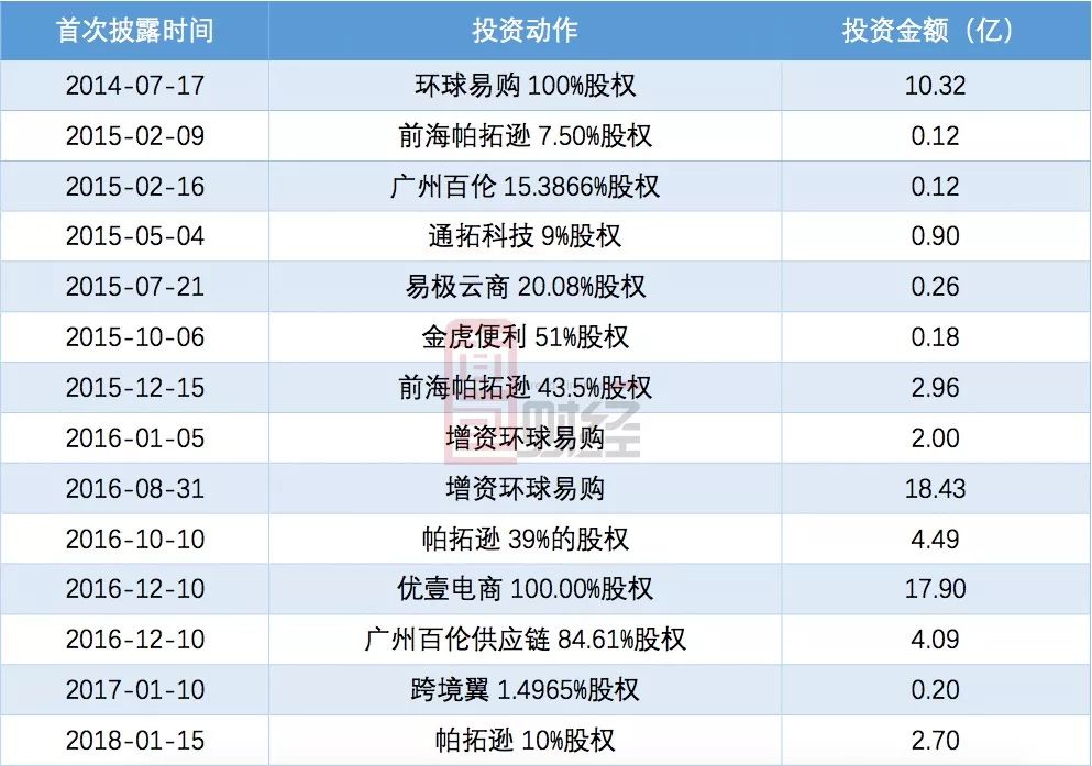 轉(zhuǎn)型電商之后,跨境通就開啟了“買買買”的連續(xù)并購模式,以下為根據(jù)公開信息整理的公司并購擴張歷程: