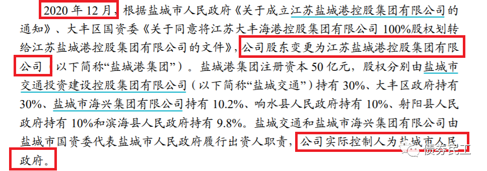 大豐控股的原股東和實際控制人為大豐區國資委。2020年12月,大豐控股的實際控制法人由大豐區國資委更為江蘇鹽城港控股集團有限公司,實際控制人由大豐區國資委變更為鹽城市人民政府。