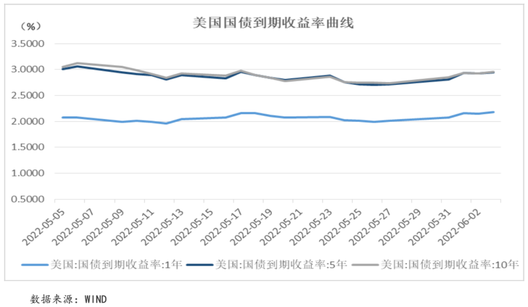 本周,美聯(lián)儲(chǔ)理事沃勒“支持加息至中性水平以遏制通脹”的“鷹派”言論以及美聯(lián)儲(chǔ)主席鮑威爾在與美國(guó)總統(tǒng)拜登會(huì)面中再度強(qiáng)調(diào)了遏制通脹的緊迫性的論調(diào)都為美債收益率上行提供支撐。此外,本周美聯(lián)儲(chǔ)正式開啟“縮表”也推動(dòng)長(zhǎng)端收益率上行。具體來(lái)看,本周1年期、5年期和10年期美國(guó)國(guó)債平均收益率較上周全線上漲11.85個(gè)BP、15.30個(gè)BP和14.55個(gè)BP至2.14%、2.91%和2.92%。