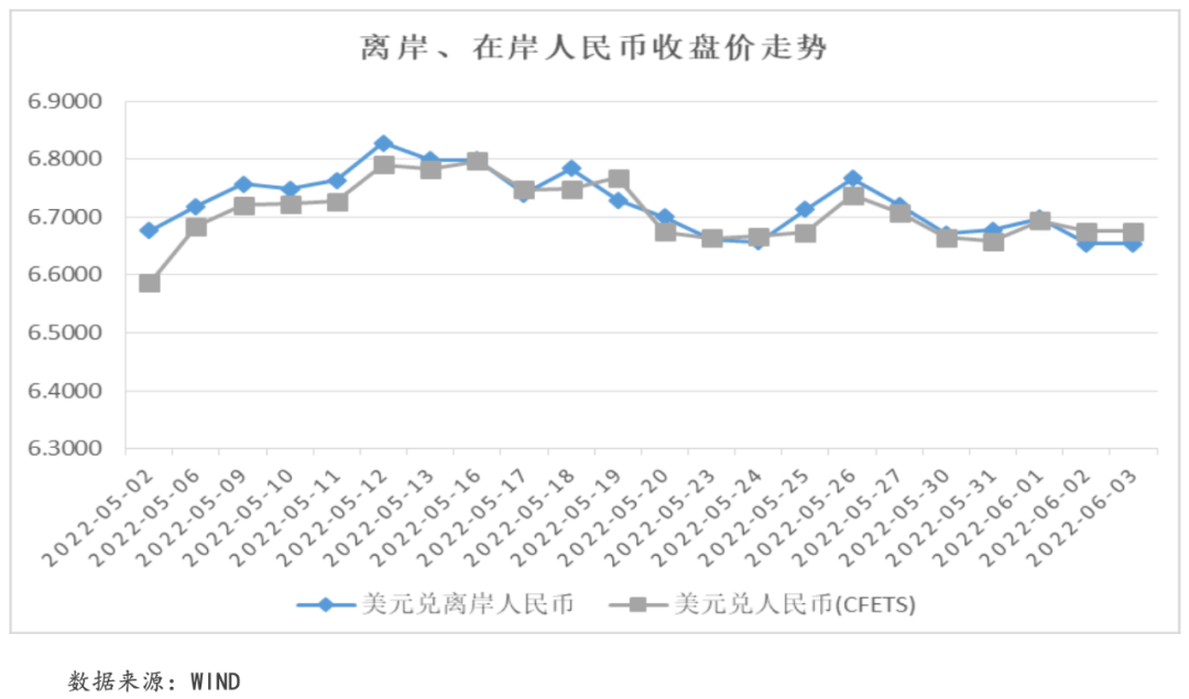 本周,中國(guó)疫情好轉(zhuǎn),上海宣布全面復(fù)工復(fù)產(chǎn),疊加一系列穩(wěn)經(jīng)濟(jì)的宏觀政策的出臺(tái),中國(guó)經(jīng)濟(jì)回暖的預(yù)期增強(qiáng)支撐人民幣匯率有所走高。截至周五,美元兌離岸人民幣匯率收于6.6537,周內(nèi)收跌1.05%;美元兌在岸人民幣匯率收于6.6750,周內(nèi)收跌0.45%。