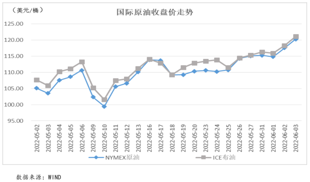 本周,在原油供給前景不確定性上揚(yáng)的背景下,國(guó)際油價(jià)一路飆升。具體來(lái)看,歐盟正式啟動(dòng)了對(duì)俄羅斯航運(yùn)石油的制裁,原油市場(chǎng)的供給局勢(shì)的不確定性大幅上揚(yáng);OPEC+雖松口同意在7月和8月增產(chǎn),但OPEC+中僅沙特和阿聯(lián)酋擁有閑置產(chǎn)能且閑置產(chǎn)能有限,因此市場(chǎng)對(duì)于石油供給前景依舊存疑。此外,美國(guó)經(jīng)濟(jì)數(shù)據(jù)的依舊強(qiáng)勁以及中國(guó)經(jīng)濟(jì)活動(dòng)逐步恢復(fù)都對(duì)于原油價(jià)格形成支撐。截至本周五收盤,NYMEX原油價(jià)格收于120.26美元/桶,周內(nèi)累計(jì)收漲2.30%;ICE布油價(jià)格收于121.08美元/桶,周內(nèi)累計(jì)收漲2.44%。