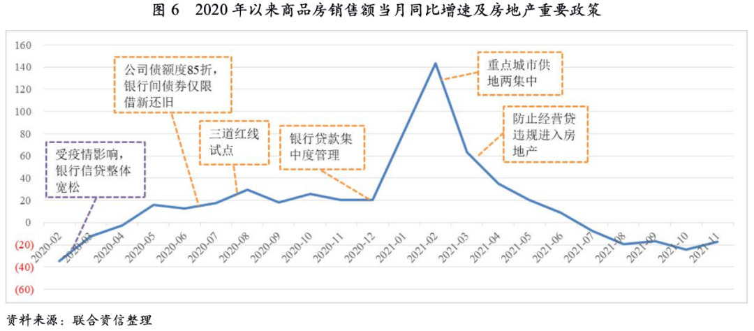 暫不考慮受疫情影響較大的2020年1-5月及2021年1-5月數據,2020年至2021年上半年期間,房地產周期走勢相對平穩,市場仍然具備一定韌性。期間,房地產融資端的管控進一步收緊,尤其是“三道紅線”對房企有息債務增長直接進行限制,這種與金融業類似的監管手段,體現了政府對于“房住不炒”、地產去金融化的決心。此外,房企債券額度和募集資金用途再度收緊、銀行貸款集中度管理等政策,體現了監管層將降杠桿作為本階段房地產調控的重點。