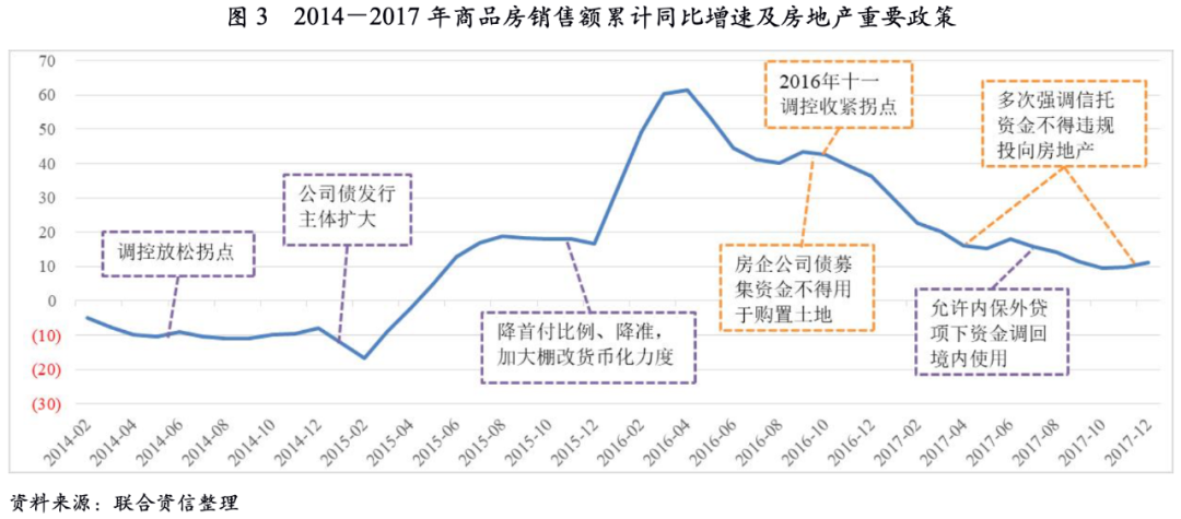 隨著熱點城市房價迅速上漲,2016年10月起,房地產調控政策開始轉向。一方面,調控政策由全國性調控改為因城施策,調控手段不斷創新,由需求端調控發展到供給端調控;另一方面,房企融資需要進一步規范,尤其是對房企以公司債募集資金購置土地、銀行表外通道等進行限制。在兩方面政策的結合下,房地產市場在2016年10月后顯著降溫,2017年行業增速恢復至較為平穩的水平。