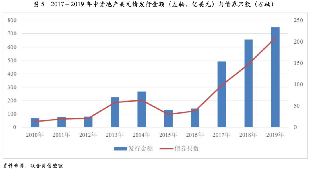 從這個階段的周期走勢可以看出,雖然行業整體呈下行趨勢,但下行的幅度一般。地產依然保有韌性的重要原因之一是美元債融資快速增長。美元債融資渠道的暢通,使得許多房企在三四線市場下行、利潤率下滑、境內融資收緊的不利環境下,仍然具備流動性。在行業集中度提升的必然趨勢下,許多房企將“規模”視為在行業中存活下去最重要的因素,利用美元債進一步加杠桿,在追求規模的道路上犧牲了企業財務健康,埋下風險隱患。