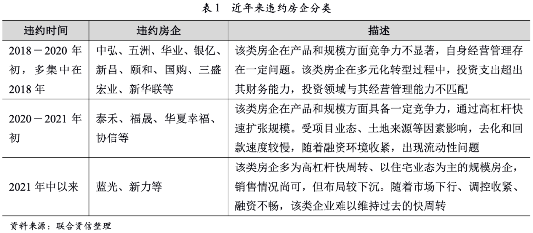 本階段的違約房企以高杠桿且經營回款相對較慢的大中型房企為主。與2018-2019年階段違約的房企不同,本階段的違約房企大多在產品和規模方面具備一定的競爭力,但受項目業態(如豪宅、產業新城、商業地產等)或土地來源(如舊改)等因素影響,去化和回款速度較慢。這些房企在信貸寬松時期依賴高杠桿維持正常運營,2018年起隨著融資趨緊開始出現流動性問題,經歷2~3年的流動性消耗后暴露風險。