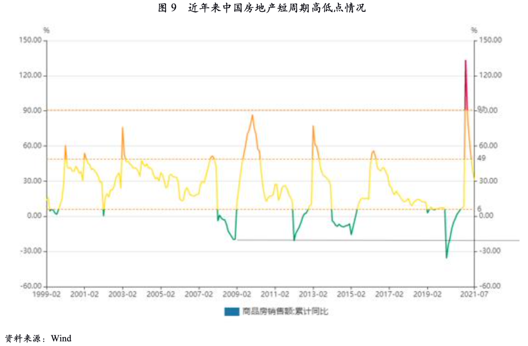 上文我們對房地產短周期規律和本輪短周期進行了回顧。與此前幾輪短周期“快上快下”的走勢相比,本輪周期下行階段顯著拉長,我們判斷本輪短周期尚未觸底。在2015年的周期低點上,棚改貨幣化等政策的推出有力推動了房地產周期進入復蘇階段;但在房地產長效調控機制逐步建立、房地產金融審慎管理的現階段,在中長周期內下行趨勢的壓力下,預計本輪周期的低點至少應抵達前3輪短周期的低點位置,即累計同比降幅20%。2021年7月以來,商品房銷售額單月同比降幅已觸及20%并持續在該水平波動,但由于上半年的小陽春,累計同比增速仍為正數,本輪短周期的下行仍將持續一段時間。