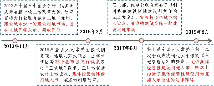 2019 年 8 月第十三屆全國人大常委會第十二次會議表決通過關于修改《土地管理法》的規(guī)定,允許集體經(jīng)營性建設用地入市,從根本上掃除了集體經(jīng)營性建設用地直接入市出讓的法律障礙。其法律政策修改流程如下所示: