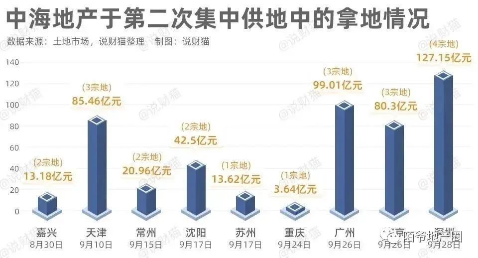 而據(jù)統(tǒng)計(jì),僅中海一家,9月以來(lái)先后在天津、常州、蘇州、沈陽(yáng)、重慶、廣州、南京、深圳等地拿下22宗地塊,累計(jì)花費(fèi)超495億元。