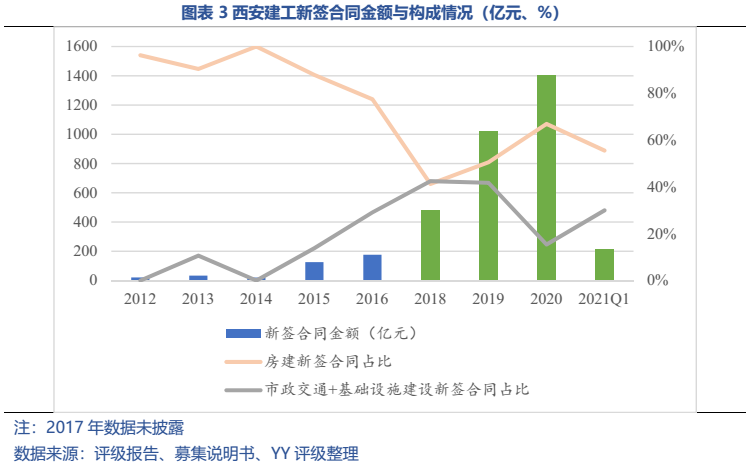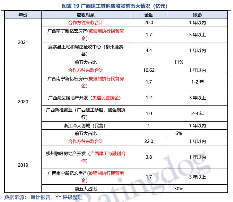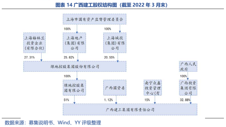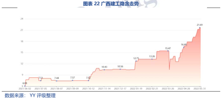 梳理分析下來,可知西安建工混改完成后新簽合同大幅增加,同時,房建占比提升,展業區域由西安市內拓展至西北區域;對綠地風險敞口51億元,其他對手方以民營房企和弱國企為主,資質較弱;綠地展期后,暫無前臺成交,預計后續隱含將明顯弱化。廣西建工混改完成后業務變化不大,仍以房建為主,集中在廣西展業;與綠地資金牽連不大(或未披露),但業務對手方資質弱,以出險房企、失信民營房企和弱城投為主;在年內到期或行權債券約60億元的情況下,綠地展期后隱含急劇弱化,YY隱含飆升至20以上。