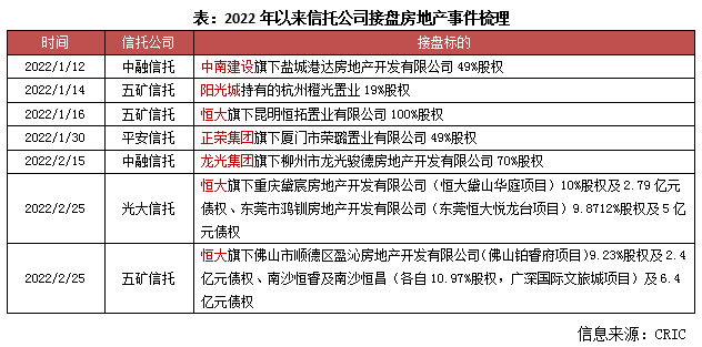 今年以來,已有五礦信托、平安信托、光大信托等相繼進入收并購市場,接手了中國恒大、陽光城、正榮集團等房企出售的項目公司股權、債權。