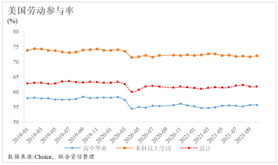 2.對(duì)新冠疫情反彈的擔(dān)憂(yōu)、提前退休人數(shù)的增加等因素導(dǎo)致勞動(dòng)參與率仍未回升至疫情前水平,本科以上就業(yè)人員勞動(dòng)參與率遠(yuǎn)高于整體水平。